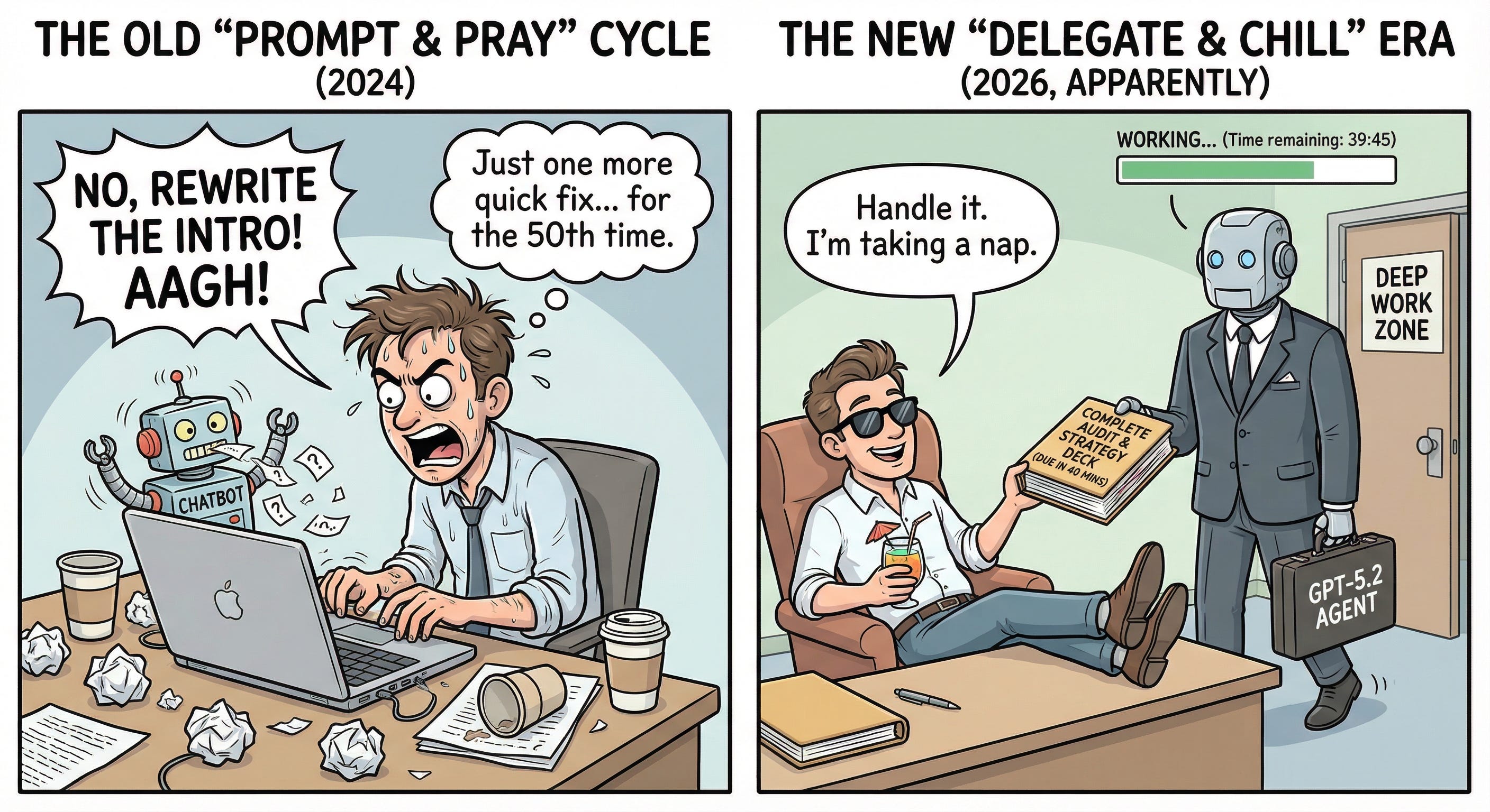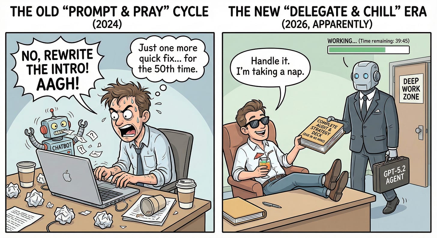 Ignore the 0.1 increment. ChatGPT 5.2 is not a small upgrade. It’s a different kind of capability, and it asks us to develop a different kind of skill. Learning how to define and delegate meaningful blocks of work to a model that can execute them—that’s what separates people who will thrive in 2026 from people who will feel increasingly left behind.